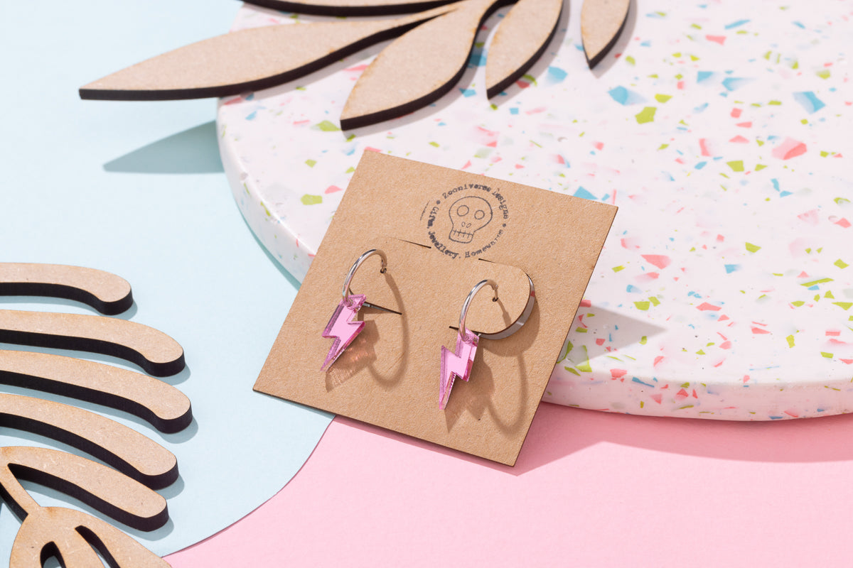 Available in a range of vibrant colours, these acrylic lightning bolt hoop earrings are all about self-expression.